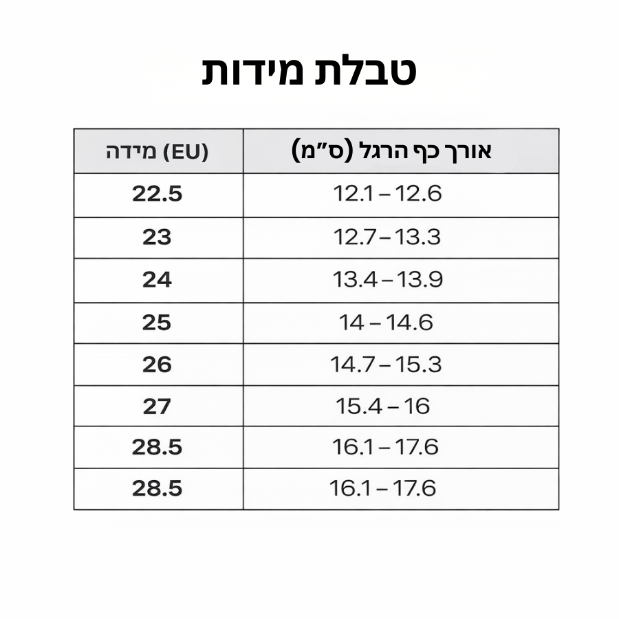 מומלץ לבחור מידה לפי אורך כף הרגל בס״מ, ולהיעזר בטבלת המידות למדידה מדויקת.